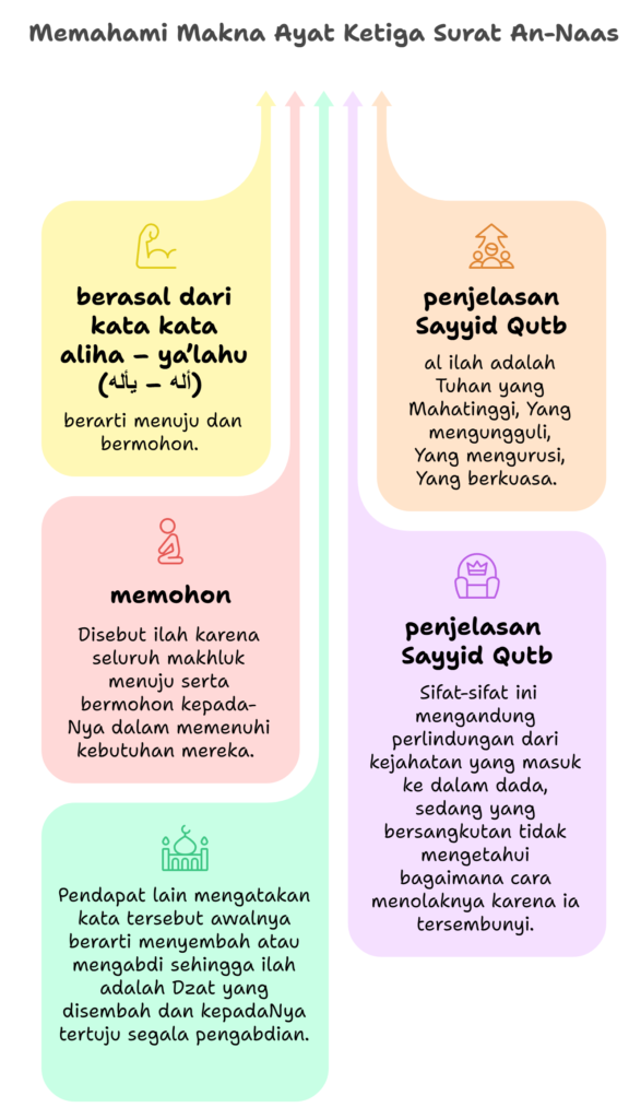 Sayyid Qutb menjelaskan al-ilah adalah Tuhan yang Mahatinggi, Yang mengungguli, Yang mengurusi yang berkuasa. Sifat-sifat ini mengandung perlindungan dari kejahatan yang masuk kedalam dada