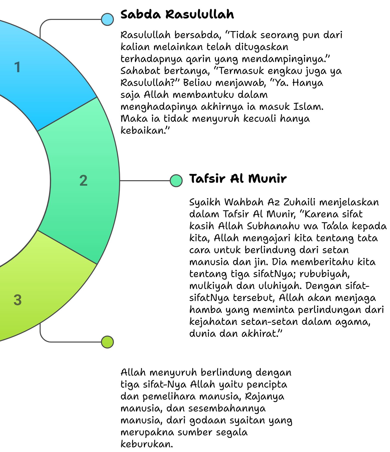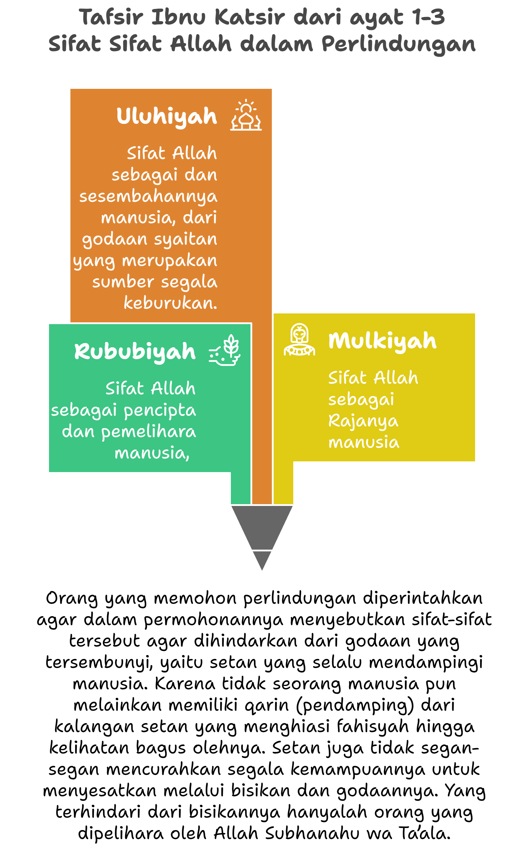 Syaikh Wahbah Az Zuhaili menjelaskan dalam Tafsir Al Munir, “Karena sifat kasih Allah Subhanahu wa Ta’ala kepada kita, Allah mengajari kita tentang tata cara untuk berlindung dari setan manusia dan jin. Dia memberitahu kita tentang tiga sifatNya; rububiyah, mulkiyah dan uluhiyah. Dengan sifat-sifatNya tersebut, Allah akan menjaga hamba yang meminta perlindungan dari kejahatan setan-setan dalam agama, dunia dan akhirat.”